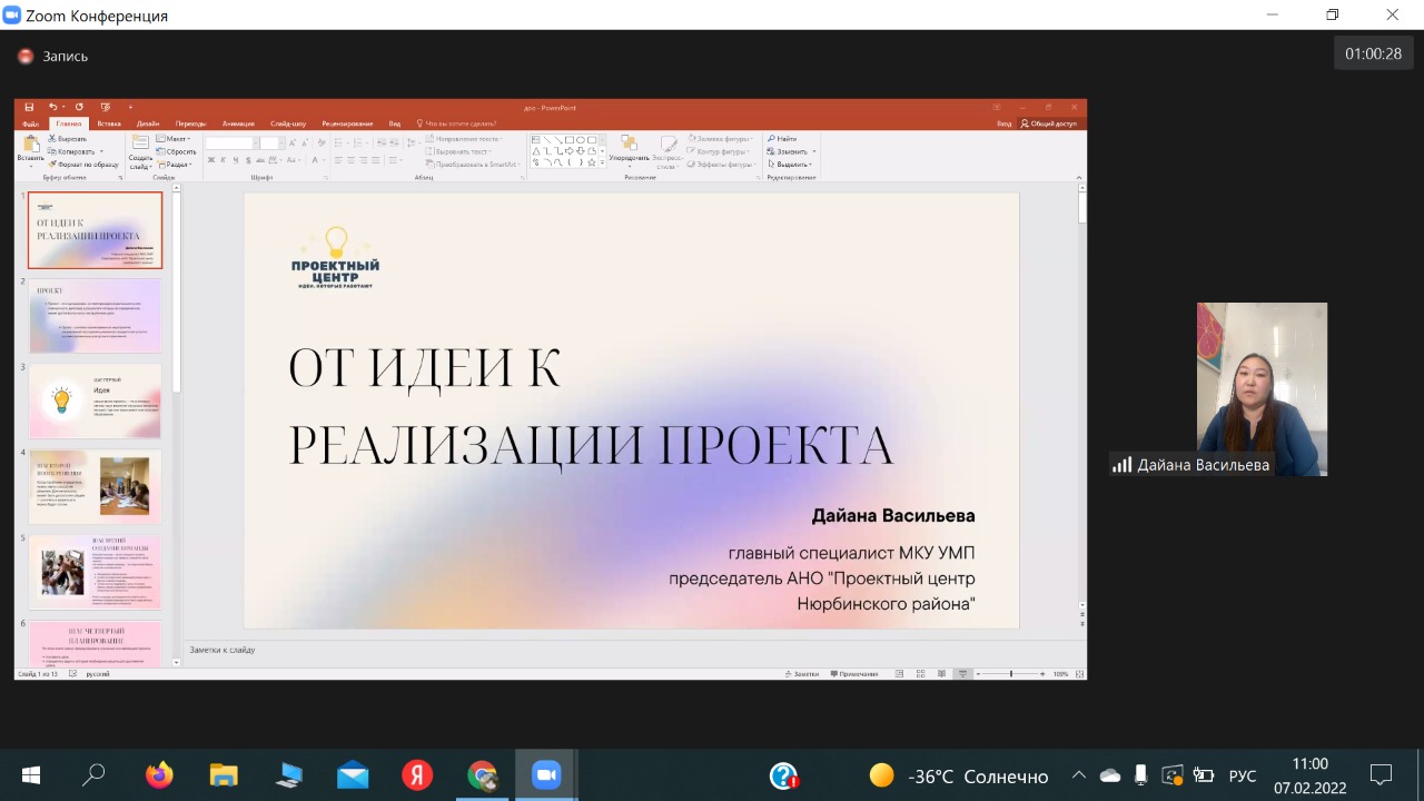 —  Васильевой Дайааны Леонидовны, главного специалиста МКУ  «Управление по молодежной политике» МР «Нюрбинский район» на тему  «От идеи до реализации  проекта»;