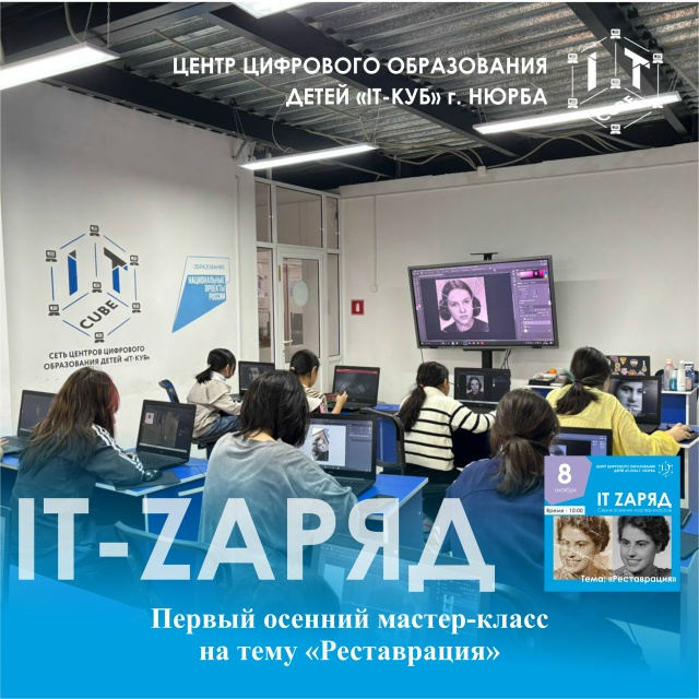 9 октября 2025 года прошёл первый осенний мастер-класс проекта «IT-Zаряд» в ЦЦОД «IT-Куб» г. Нюрба. Первое мероприятие было посвящено искусству цифровой реставрации старых изображений.Мероприятие провела педагог направления «Компьютерная графика» Эдуарда Александровна Иванова, ребята познакомились с возможностями программы «Adobe Photoshop», изучили основы восстановления повреждённых снимков и освоили профессиональные техники обработки цифровых изображений. Благодаря современным технологиям, учащиеся смогли вернуть жизнь старым фотографиям, стереть следы времени и придать новым кадрам профессиональный вид. Программа «Adobe Photoshop» стала идеальным инструментом для освоения искусства реставрации, благодаря своему широкому функционалу и простоте использования даже начинающими пользователями.