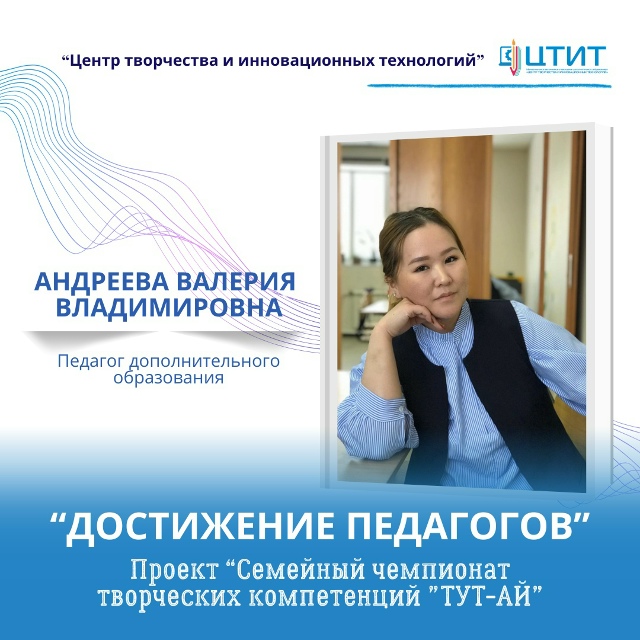Отличные новости! С радостью сообщаем, что педагог Центра творчества Валерия Владимировна Андреева успешно прошла отборочный этап и вышла в финал Республиканского конкурса лучших практик в сфере профориентационной работы «Дальневосточные горизонты»! Конкурс организован АНО ДПО «Центр опережающей профессиональной подготовки Республики Саха …