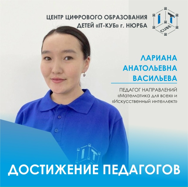 Лариана Анатольевна Васильева, педагог Центра цифрового образования детей «IT-Куб» города Нюрба, направлений «Искусственный интеллект» и «Математика для всех», приняла участие и получила диплом I степени Всероссийского конкурса профессионального мастерства «Образовательные инновации». Организатором конкурса выступает Международная академия образования (International Academy of …
